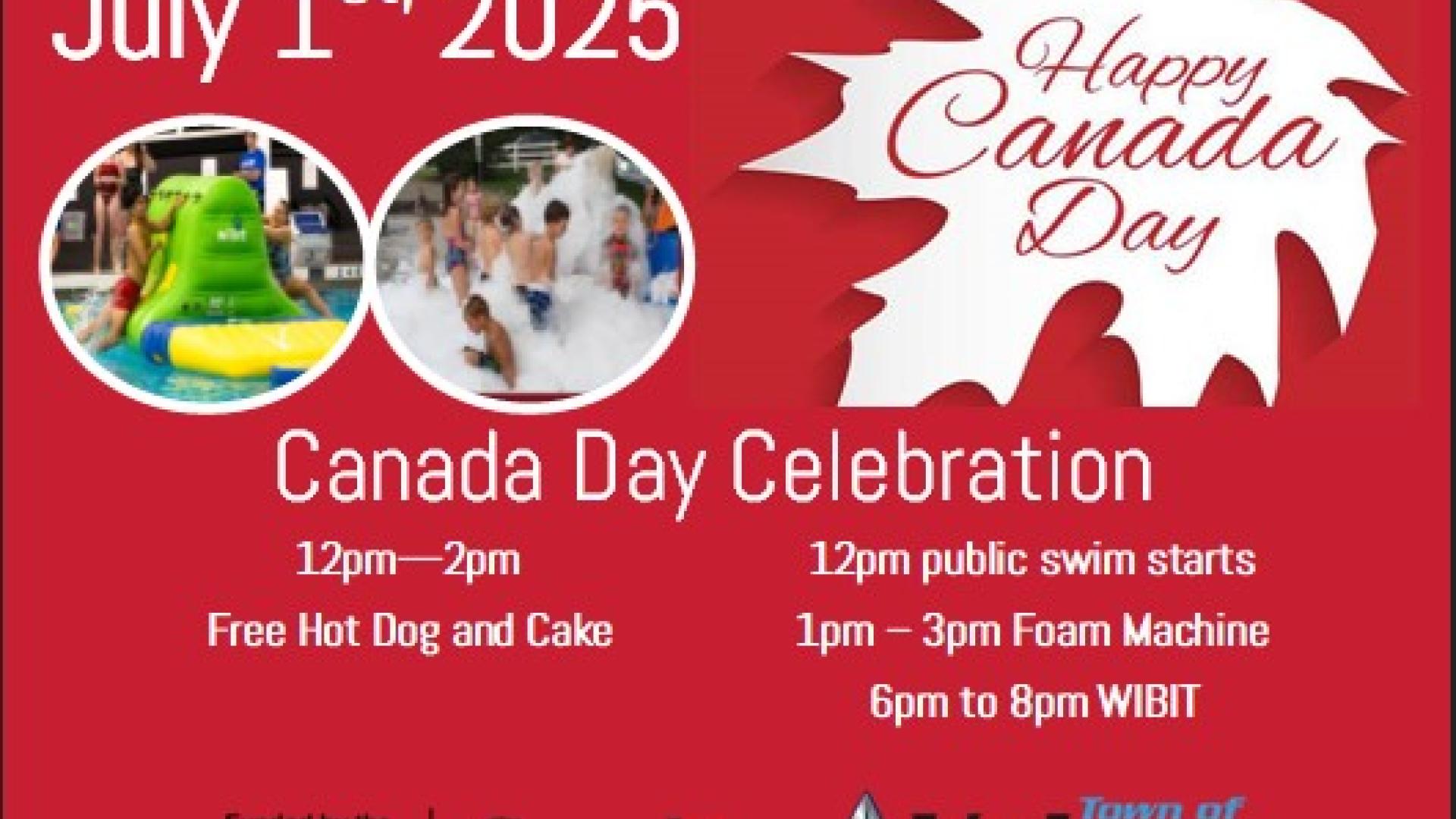 July 1st, 2025 Canada Day Celebration at Vulcan Pool. Public Swim starts at 12pm, Foam Machine 1-3pm, WIBIT 6-8pm. Enjoy a free hotdog from 12pm-3pm while supplies last.