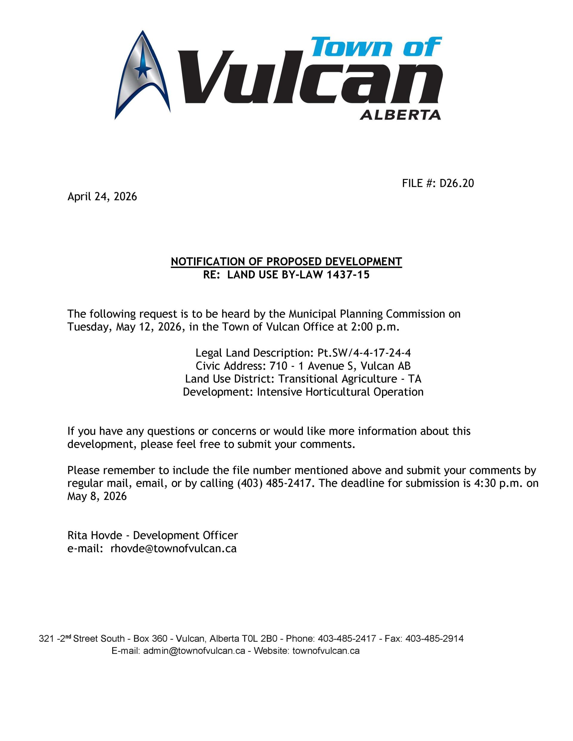 Town of Vulcan Notices
