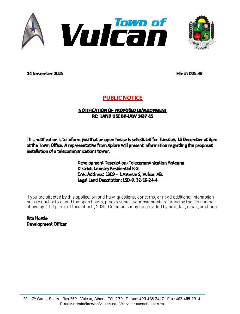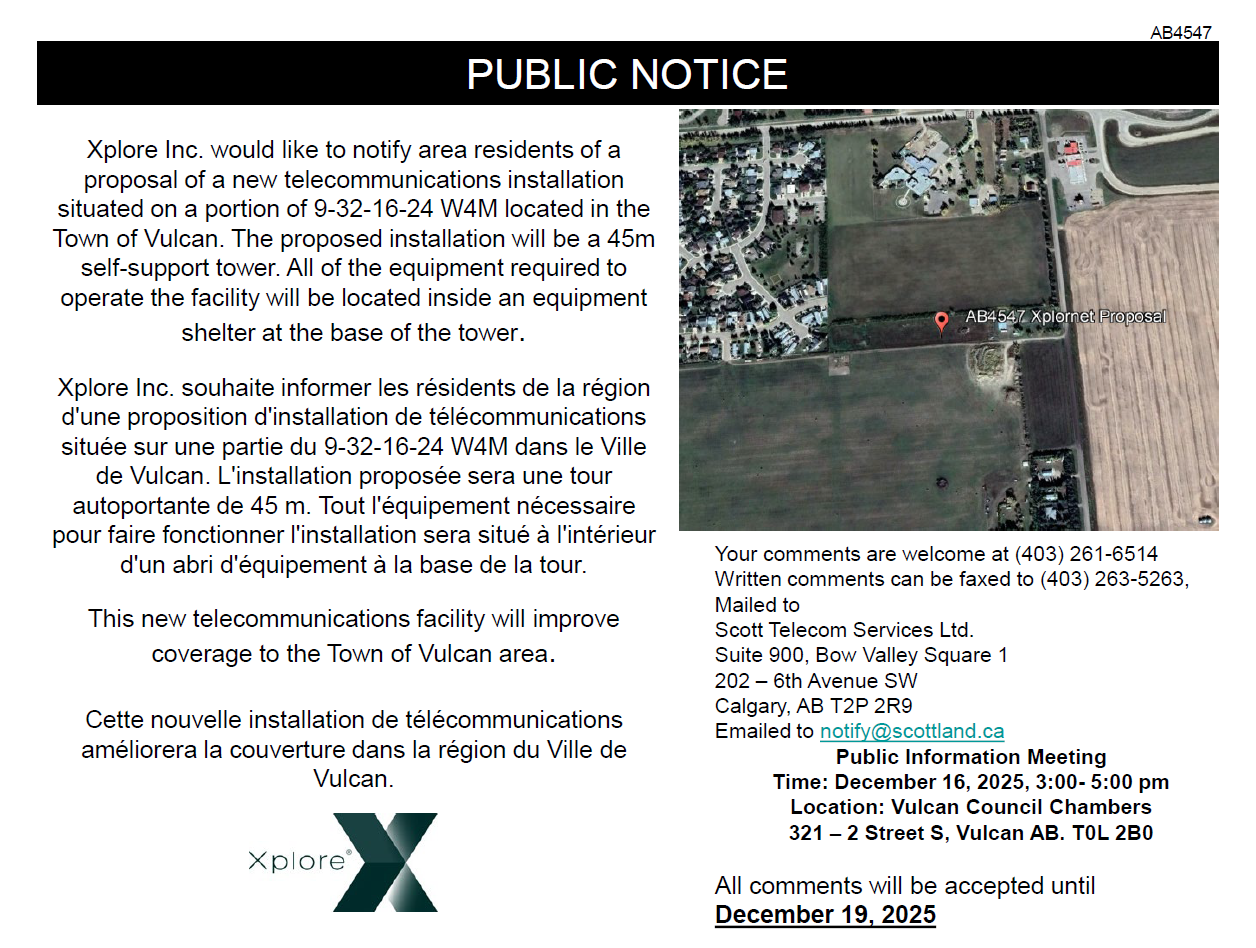 Xplore Inc. (Explore would like to notify area residents of a proposal to construct a telecommunications installation on a portion of 9-32-16-24 W4M located in the Town of Vulcan.  The proposed installation is a 45 m (148ft) self-support tower with the approximate corresponding GPS of 50.393261, - 113.258480.  In addition, a public notice will be published on the Town of Vulcan Facebook page the same day as mentioned above.